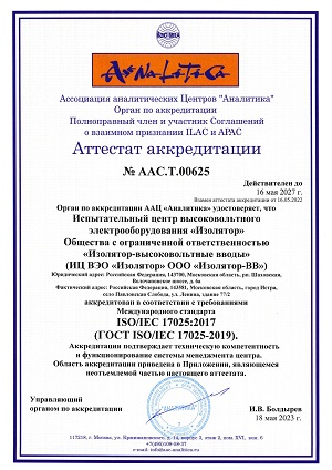 19 июля 2023 года Ассоциация аналитических центров «Аналитика» подтвердила техническую компетентность и функционирование системы менеджмента испытательного центра высоковольтного оборудования «Изолятор».